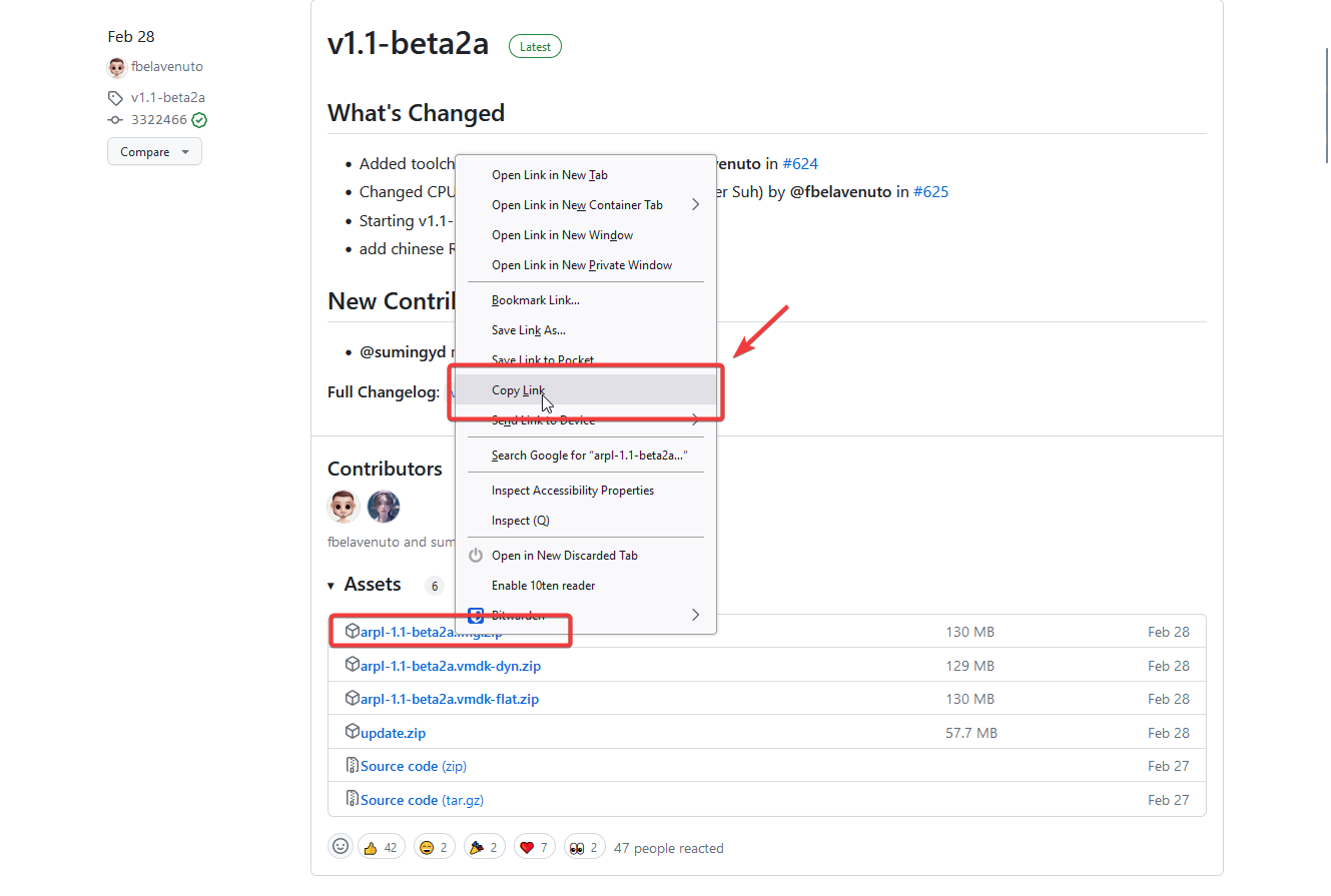 Bấm chuột phải vào chỗ link arpl-1.1-beta2a.img.zip, chọn Copy Link.
