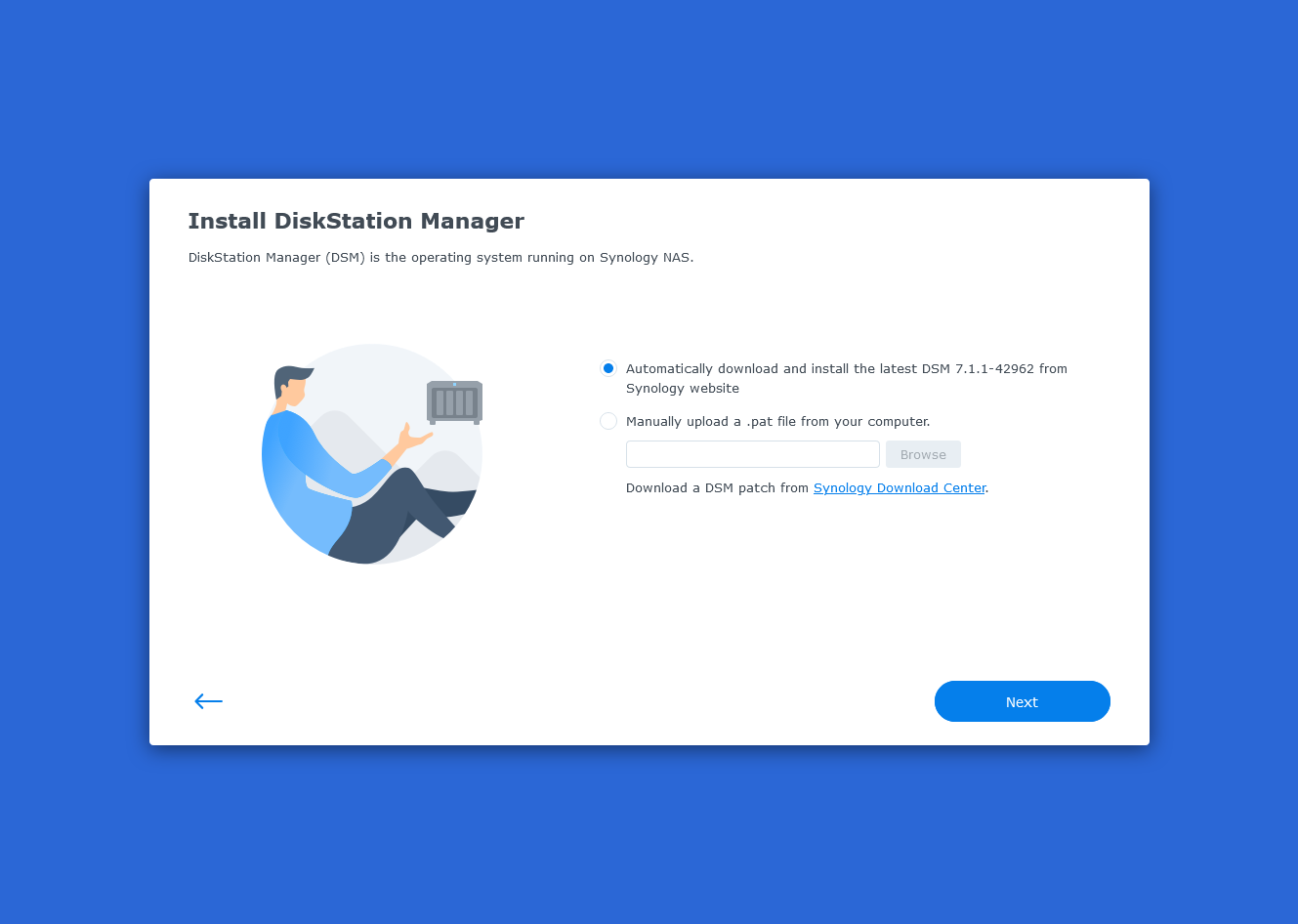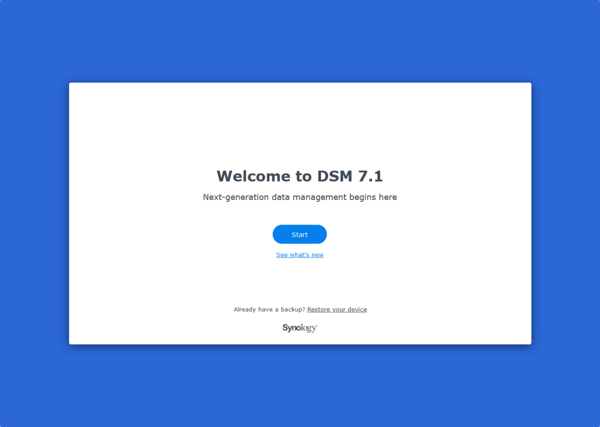 Nếu quá trình cài đặt suôn sẻ, sau 10′ bạn sẽ thấy hiện ra màn hình như dưới đây. Bấm Start để bắt đầu cấu hình thông số cho DSM 7.1