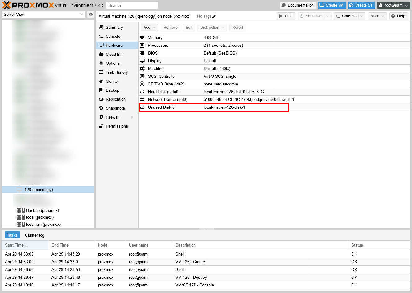 Quay lại giao diện của Proxmox, chọn máy ảo xpenology, truy cập vào mục Hardware, bạn sẽ thấy có thêm mục Unused Disk 0. Double click vào đó.