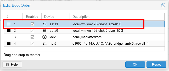 Truy cập tiếp vào phần Options, chọn Boot Order. Chọn vào cột Enable của ổ đĩa local-lvm:vm-126-disk-1,size=1G và kéo lên cùng để ưu tiên làm Boot Device khi khởi động máy ảo.