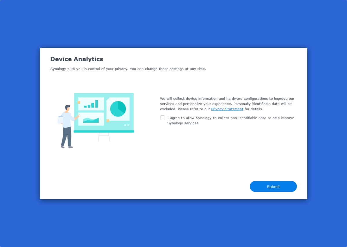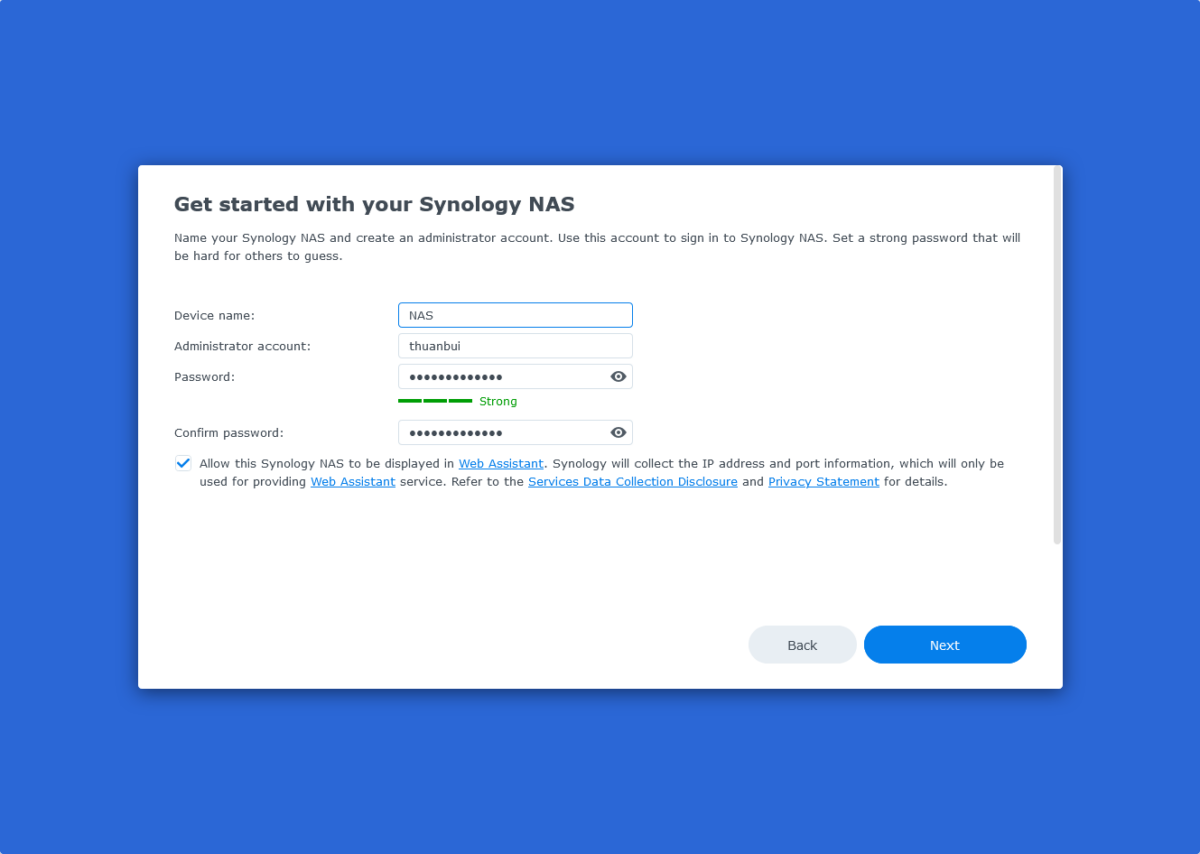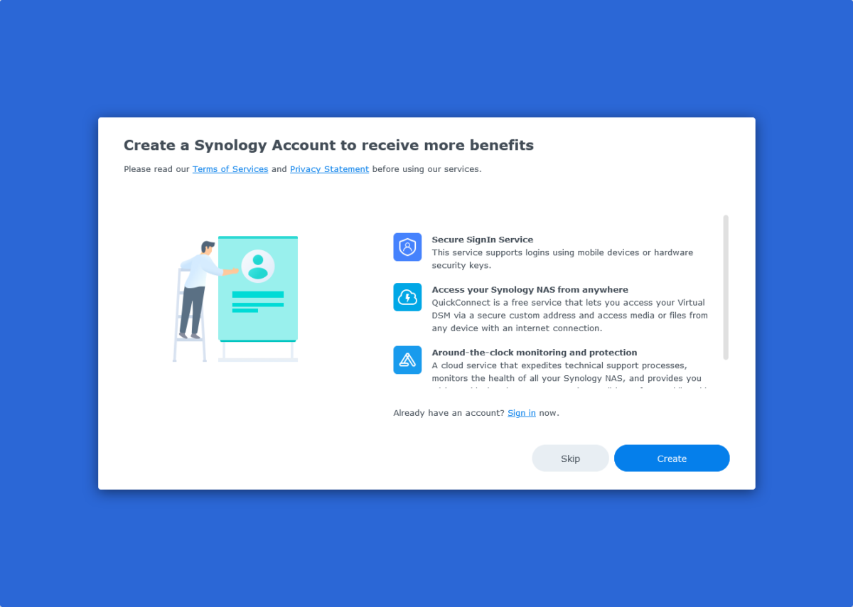 Phần này có thể bấm Skip bỏ qua, chưa cần kết nối với tài khoản Synology.