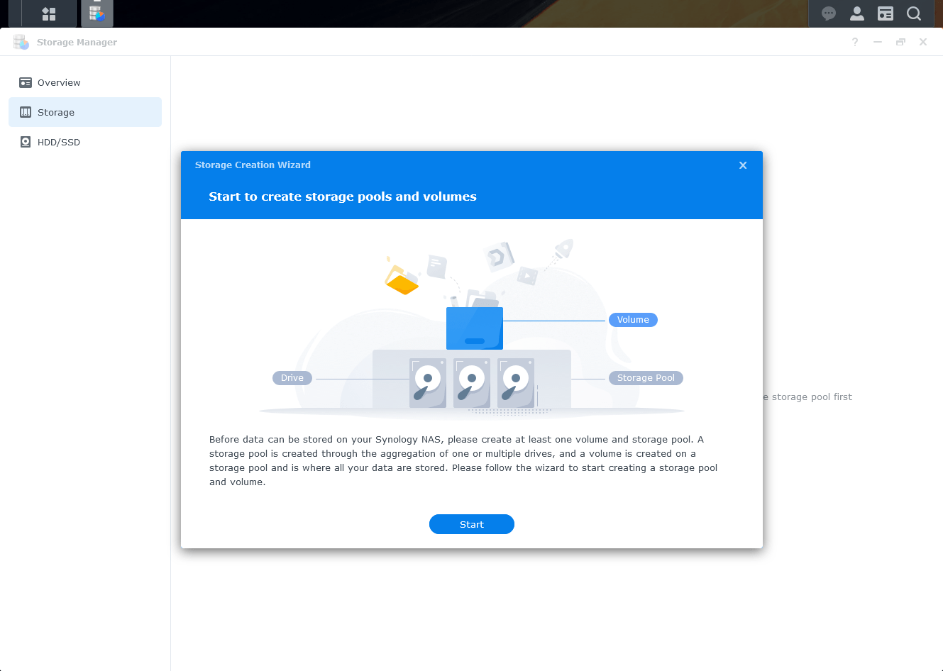 Làm tiếp luôn bước cài đặt Storage Pool. Bấm Start để bắt đầu.