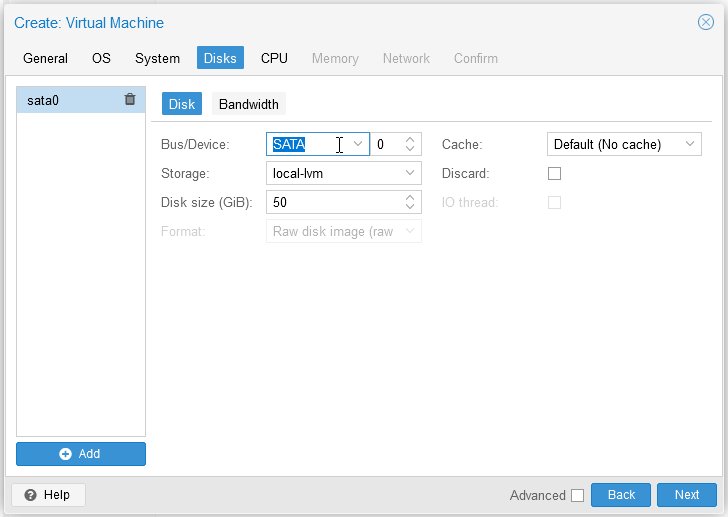 Mục Disks: tạm thời mình tạo ổ đĩa ảo dung lượng 50GB để test thử. Thông số Bus/Device bắt buộc phải chọn SATA. Bấm Next.