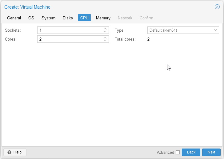 Mục CPU: Chọn 1 hoặc 2 Cores hoặc hơn tuỳ nhu cầu. Bấm Next.