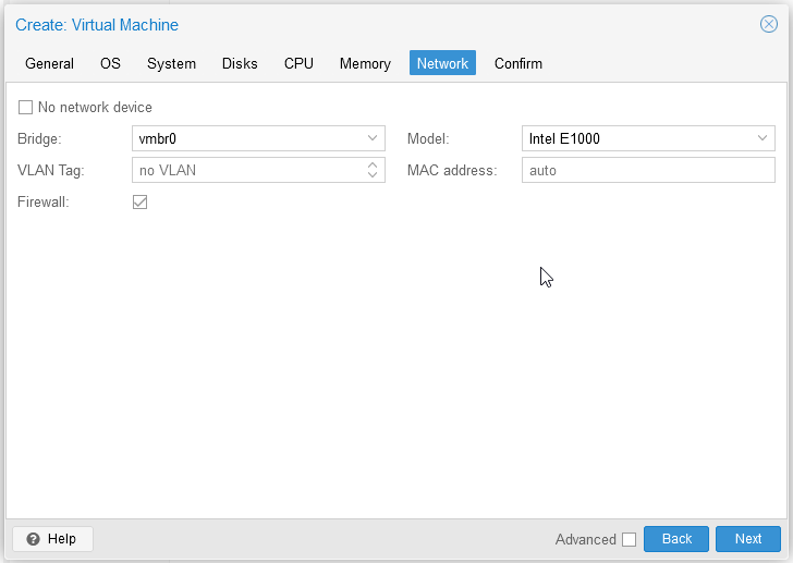 Mục Network: thông số Model cần phải chọn Intel E1000. Bấm Next.